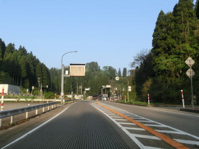 | やや急な勾配を上っていると名もなき峠を越えて下りに転ずる。沿線には付帯施設のないパーキングしかないが、城山を越えた南には小矢部市の市街地が広がっている。再び上りに転じた2車線道路を走っていると小矢部トンネルをくぐる。小矢部トンネルを出るとR471との安楽寺ICの側道が分岐する。R471を小矢部市街地方面に進むと富山r42と交差するが、その区間はR8の旧道と思われる。 | ||