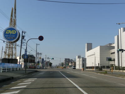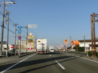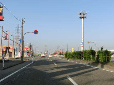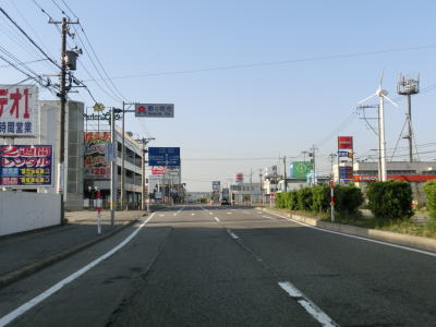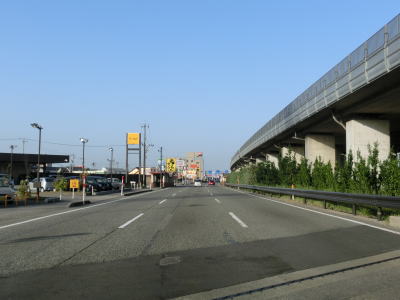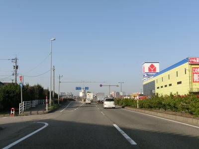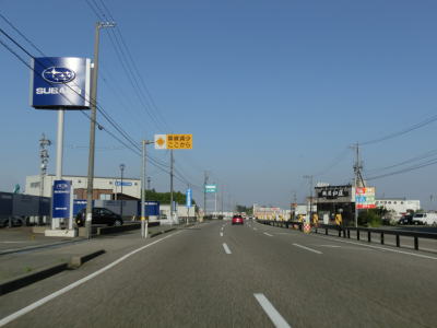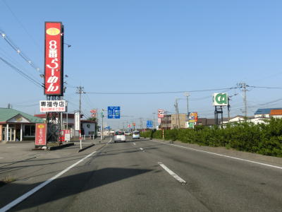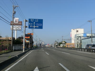 | 乾東交差点からは車線が増えて片側3車線になる。白山市(旧松任市)の市街地に近く、沿線には飲食店を含む商業施設が多く一桁国道のバイパスらしい風景となっている。まだかろうじて早朝と言える時間帯だったが交通量は多く、大型車の割合も多い。白山市の市役所の南に位置する総合運動公園口交差点を過ぎると右側車線がなくなり、以降は片側2車線となる。車線の数は減ったものの周囲の状況は特に変わらない。 | ||
