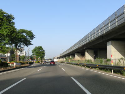 | 田中高架橋で石川r200田中交差点をオーバーパスし、金沢市民球場の北を通り過ぎた後に浅野川橋と北陸鉄道浅野川線の上を通過する。橋梁部分は間を走る北陸道とほぼ同じ高さを走っている。浅野川橋から平面道路に戻ると車線が増えて片側3車線になる。 | ||