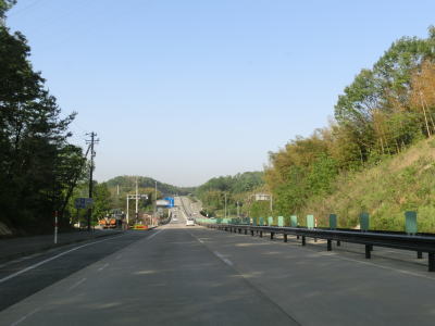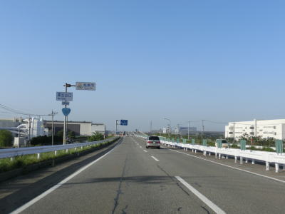 | 梯川を渡った先でR360佐々木ICを通過する。インターの名称としては佐々木ICとなっているが、その下の交差点の名称は八幡東交差点である。千代・能美ICから佐々木ICの間は中央分離帯のある片側2車線道路だが、上下線ともに中央寄りの車線にはポリドラムが置かれており走行できない。ラバーポールもなくなり対面2車線の八幡北跨道橋を通過すると上り勾配になる。 | ||