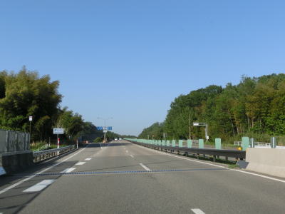 | 大長野高架橋以南は中央分離帯もなくなりラバーポールで仕切られた片側1車線道路を走る。ごく緩やかな左カーブを曲がると石川r54との小杉ICを通過し、平面交差点からの側道が合流した直後に小松市に入る。実は小杉ICの北でも約400mだけ小松市域を通っているのだが、市境標識は設置されていない。市境を何ヶ所も通過しているが、なぜこの区間だけ境標識が設置されていないのだろうと疑問に思ってしまう。 小松市に入って能美1号跨道橋と能美2号跨道橋を通過するが、2号跨道橋の上で千代・能美ICの側道が分岐する。インターの名称に“能美”が入っているが、これは能美市ではなく小松市能美町を指している。 |