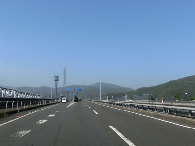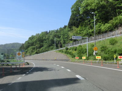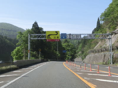 | 新桜橋を渡り終えると上り勾配になり1.7kmの登坂車線が始まる。武生トンネル区間と異なりカーブは少なく緩やかなものばかりである。大良集落の南端で登坂車線が終わり、左にカーブすると歩道もなくなる。登坂車線の終点には1.0km先に4.0mの制限高規制がある事を警告する標識が立てられている。 | ||