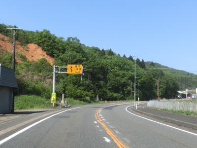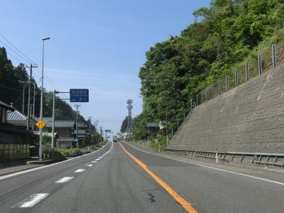| 阿曽集落は内陸側を迂回するルートで家屋と田畑の間を通っている。全長以上の長さのロックシェッドに挟まれた黒崎トンネルを通過し、五幡集落や江良集落を通り抜ける。五幡集落は2車線ながら歩道がなく家屋が密集しているため、乗用車はともかく大型トラックだと気を遣った走行になるだろう。江良集落は砂浜のすぐ傍を走っており、台風などの際は波飛沫がかかりそうな場所である。 | ||