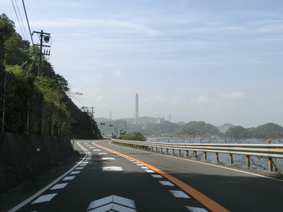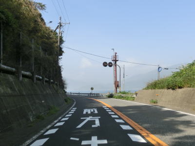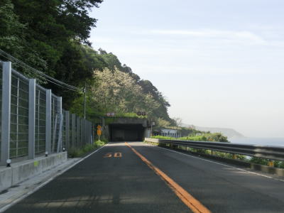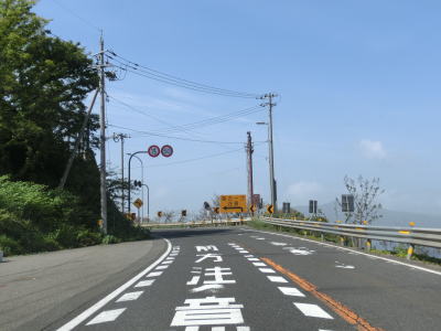 | 江良集落を過ぎると少し勾配を上って標高20m程度の場所を走る。勾配は緩やかだが急カーブが連続している。敦賀湾越しに敦賀火力発電所の煙突を望みながらカーブの多い2車線道路を走っていると赤崎集落の手前で雨量通行規制区間の終点を通過する。その後は赤崎集落を通り抜けるが、それまでのような険しさは感じられない。 | ||