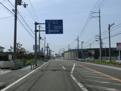 | 近江橋で天野川と滋賀r247をパスして、引き続きJR東海道本線を岩脇跨線橋で越える。その先でR21西円寺交差点に突き当たり、右折して大津・彦根方面に進む。案内標識ではT字路のような描かれ方だが、航空写真を見るとY字路に近い形状である。各方向とも交通量が多い交差点のため、左折矢印を積極的に利用した切り替わり方となっている。 | ||