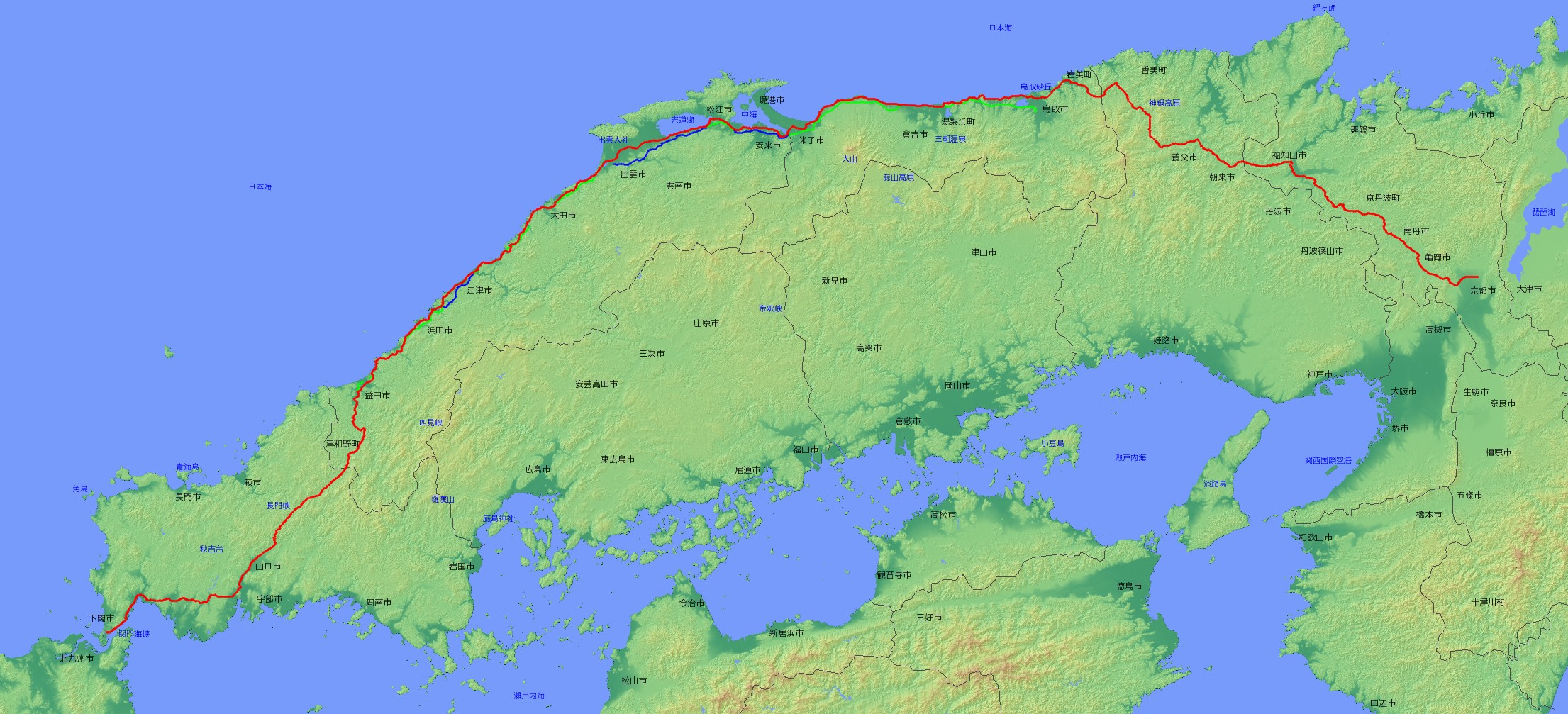 | 主な経由地 | 京都府京都市〜亀岡市〜南丹市〜京丹波町〜福知山市〜 〜兵庫県朝来市〜養父市〜香美町〜 〜鳥取県岩美町〜鳥取市〜湯梨浜町〜米子市〜 〜島根県安来市〜松江市〜出雲市〜大田市〜江津市〜浜田市〜益田市〜津和野町〜 〜山口県山口市〜宇部市〜山陽小野田市〜下関市 |