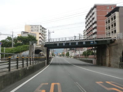 | 千原交差点を過ぎると沿線の商業施設どころか建物が急に少なくなる。緩やかな勾配を上ってJR山陰本線の上を通過した後に左にカーブしながら勾配を下る。その後は山陰本線と桂川の間を走る。 | ||