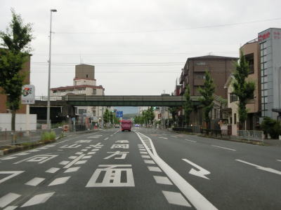 | 五条天神川交差点を過ぎて西京極総合運動公園の北で左カーブを曲がる。葛野西通交差点を過ぎると勾配を上った先で西大橋を渡る。橋の手前の左側には京都r801が交差しているが、これは京都八幡木津自転車道線である。西大橋の下を流れる桂川は区境でもあるため橋より西は京都市西京区である。 西大橋からの勾配を下り切った所で信号機のない交差点があるが、南側の道路はr801である。西大橋の下流側の歩道はr801が重複していると言える。市道(区道?)との交差点を通過した直後に京都r123上桂御正町交差点を通過する。 |