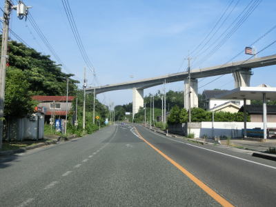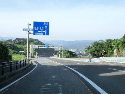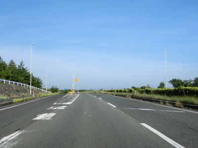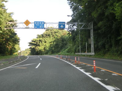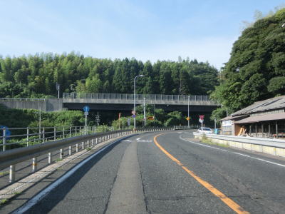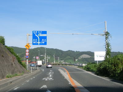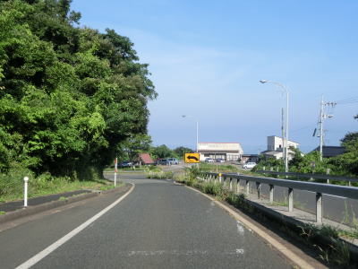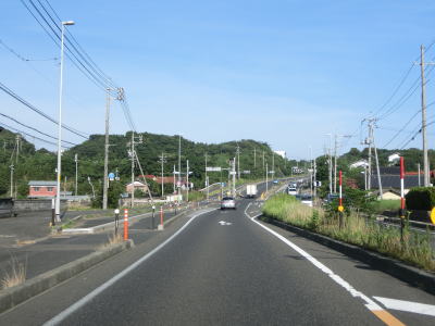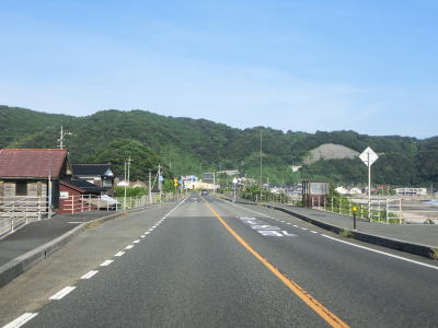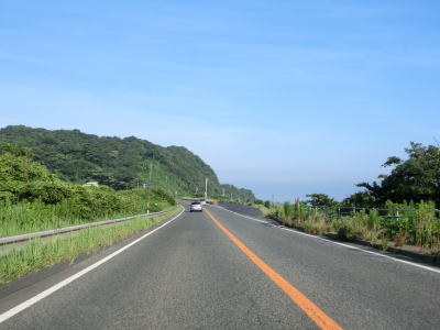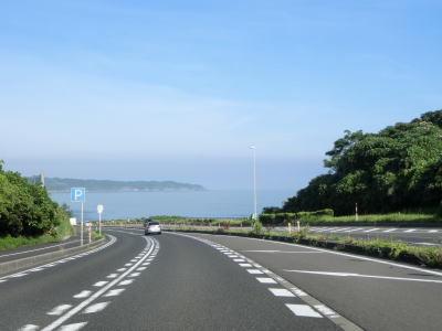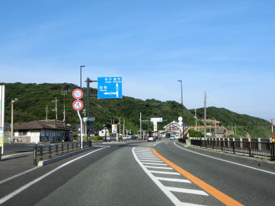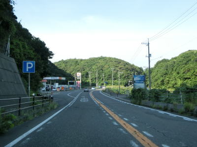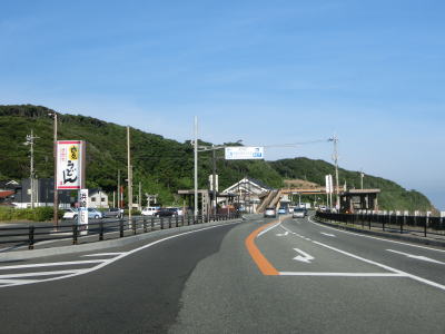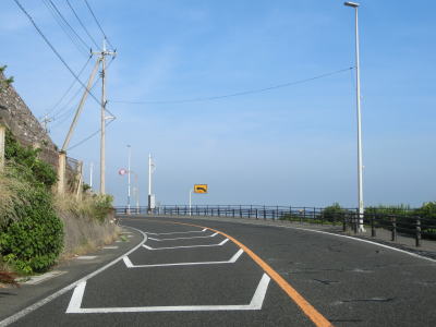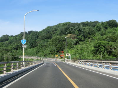 | 八束水交差点からも対面2車線道路が続いており、交差点からしばらくは海沿いを走る。緩やかな左カーブを曲がって海岸線から離れると上り勾配となり船磯集落の南から西にかけて回り込むようなルートを通る。勾配は8%とややきつく登坂車線が設置されている。上下線が分離した所で左カーブを曲がって魚見台という展望台の前を通過する。 | ||