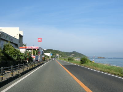 | 溝川集落を通り過ぎると右側に日本海が見える。起点から210km程走ってようやく海沿いとなる瞬間である。そのまま海沿いを走っていると鳥取r258交差点を通過し、その直後に道の駅「神話の里白うさぎ」の前を通る。道の駅の中には某コーヒーショップの名称をもじったすなば珈琲がある。 | ||