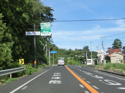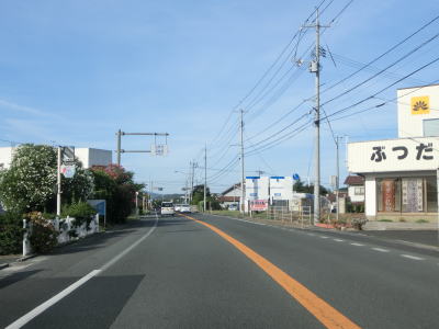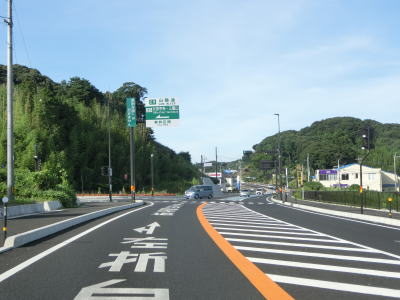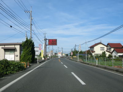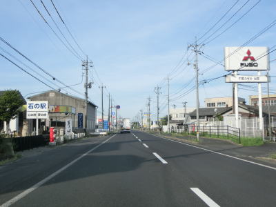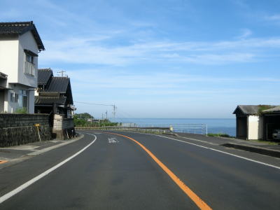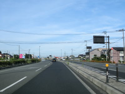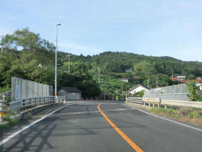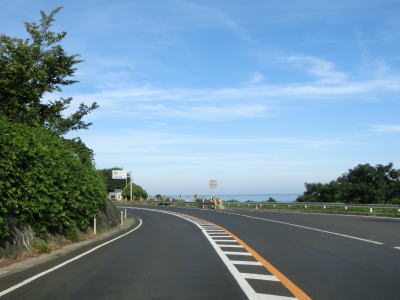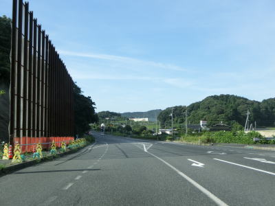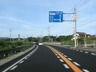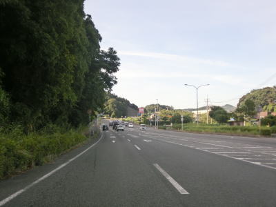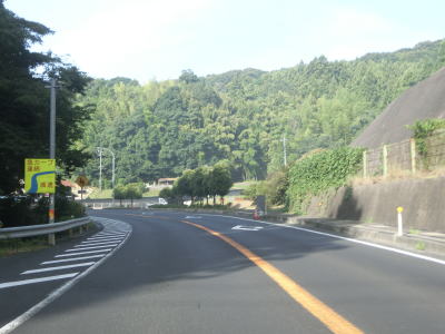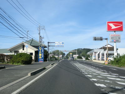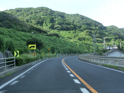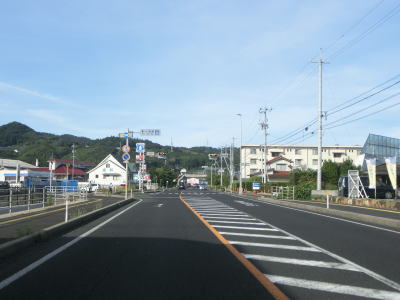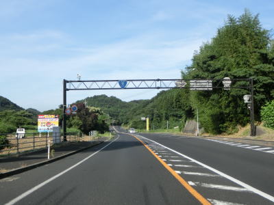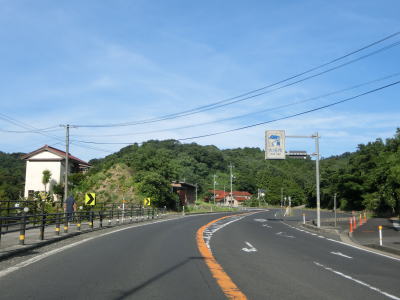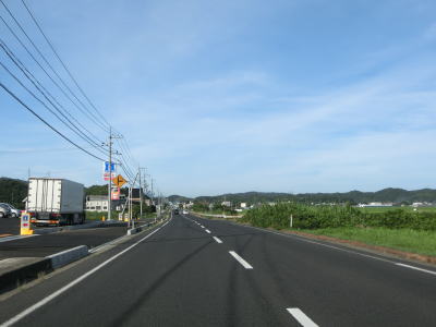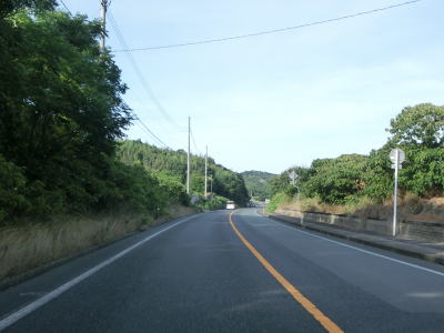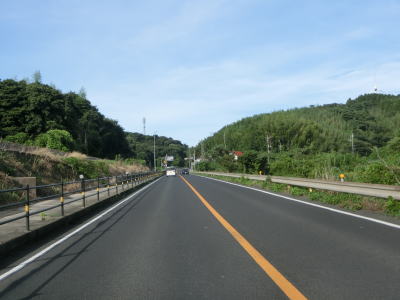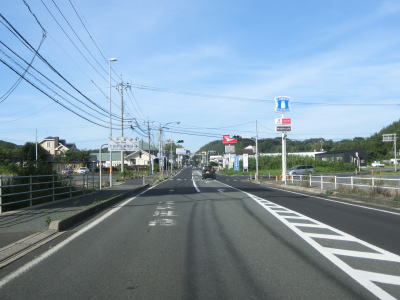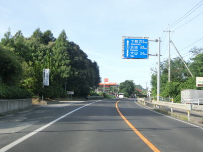 | 差海交差点の先に立っている案内標識に下関が表示されているが、その距離は274kmとかなり大きな数字である(大島交差点の西の案内標識では277km)。R9の残りの距離の近似値のため、R9を経由した数字と思われる。道路状況としては緩やかなアップダウンとカーブを繰り返す2車線道路が続いており、長閑な風景の中を走り抜ける。 | ||