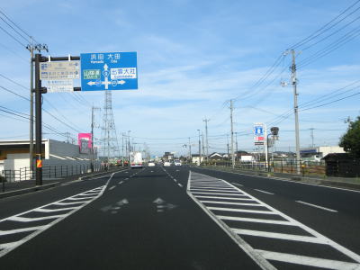| 緩やかな勾配を下っていると車線が増えて4車線道路となり、島根r285諸友交差点を通過する。中央分離帯が現れて片側2車線道路になると大きく右にカーブして綿田跨線橋でJR山陰本線をオーバーパスする。綿田跨線橋からは上り勾配となるが、島根r30大田市駅交差点を過ぎると下り勾配となる。 大田市の中心部の北部を走っていると島根r174長久交差点を通過する。その後、大田橋を渡った先でR375・島根r174和江漁港入口交差点を通過する。交差点の名称に漁港入口とあるが、和江地区とは3km程離れており海に近い訳ではない。 |