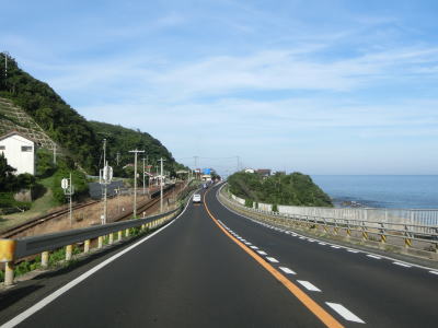 | 下田橋からは直線的な上り勾配の2車線道路を走る。左カーブを曲がった後に小田跨線橋でJR山陰本線をオーバーパスしてから右にカーブして勾配を下る。以降はカーブは多いものの概ね走りやすい道路状況である。海に近い場所を走っており眼下に日本海を望む事ができ、しおさいロードパーキングエリアが設置されている。 | ||