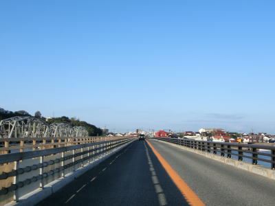| 渡津町交差点からはR186が重複しているが、おにぎり等がないため重複区間とは認識し難い。大きく左にカーブして江川橋で江の川を渡る。上流側には歩道用の橋が隣接しており、さらに少し離れた上流側には山陰本線の鉄道橋が架けられている。さらに上流にはR9江津バイパスの新江川橋が架かっている。 江川橋を渡り終えた直後の橋から下り勾配区間は車線幅が狭い。その後も市の中心部を通っていえるため若干の狭苦しさを感じる。江津市駅前交差点を通過するが、駅前のロータリーは国道に接している。 |