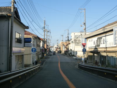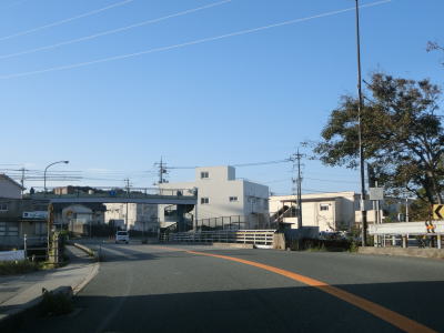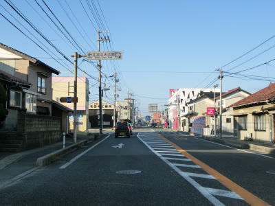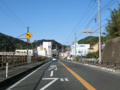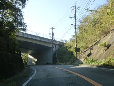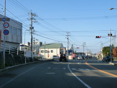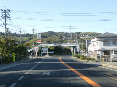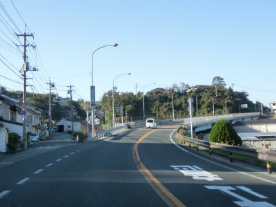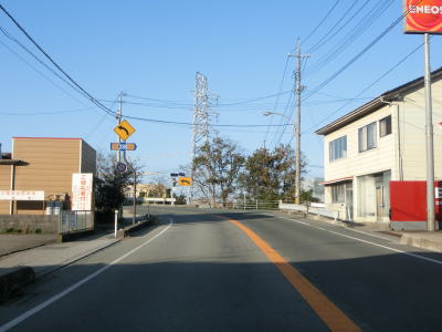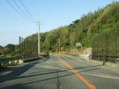 | 江津市駅からも2車線道路だが車線幅が多少広くなるため走りやすく感じる。緩やかな上り勾配の左カーブを曲がるが、カーブ部分には島根r238が交差している。カーブの先で江津跨線橋でJR山陰本線をオーバーパスして右カーブを曲がって島根r112江津町交差点を通過する。江津跨線橋の南にr112の現道が交差しているが、ウォッちずには記載されているものの市役所内の通路と化しており車止めも設置されているため通り抜ける事ができなくなっている。 | ||