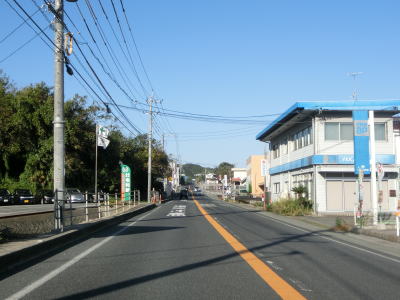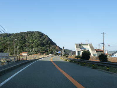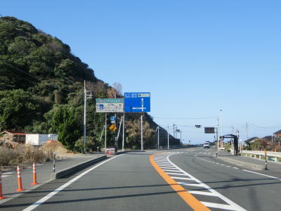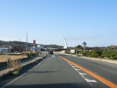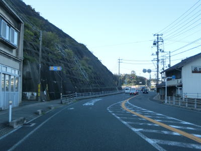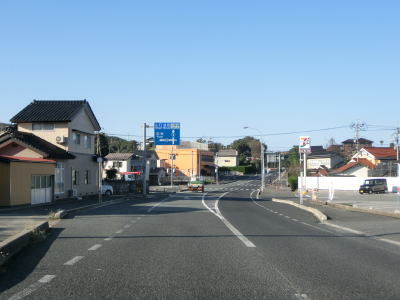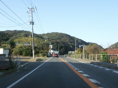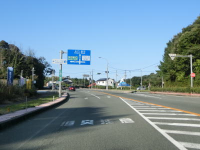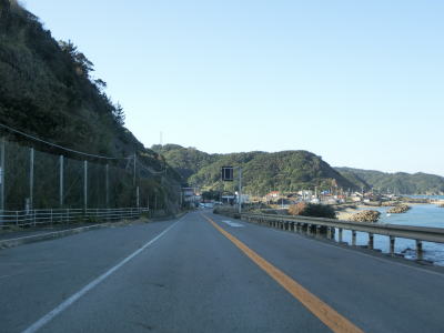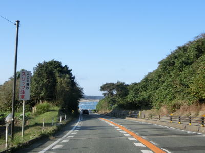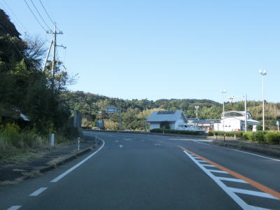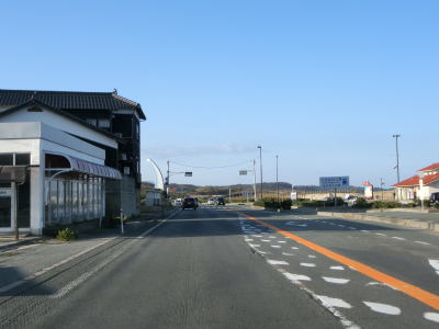 | 折居駅のすぐ傍を通るが、駅に出入りできるのは海寄りの市道のみである。緩やかな上り勾配を走っていると島根r303交差点を通過する。以降もしばらく上り勾配が続いている。道の駅「ゆうひパーク三隅」を通過するが、高台に位置しており日本海が良く見える立地である。 | ||