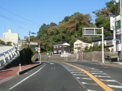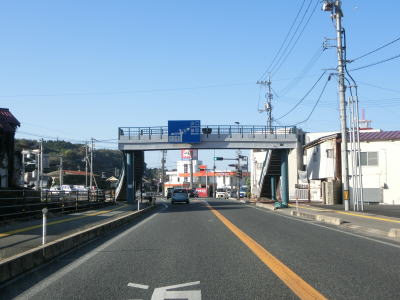 | 江津市の中心部から離れて沿線の家屋が少なくなるが、集落そのものは途切れずに続いている。緩やかな勾配を上って跨線橋でJR山陰本線の上を越えてから緩やかな勾配を下る。前方には海が見えるが海水浴場に近いため飛砂でスリップする可能性がある旨が警告されている。 | ||