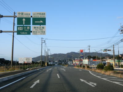 | 小郡バイパスは高規格な自転車専用道路とあって制限速度は70km/hに設定されている。原跨線橋でJR宇部線の上を通過した後にR2・R190・山口r230との岡屋ICを通過する。この交差点はR190の起点であり、内陸を通っているR2とR9に対してR190は海に近い場所を通っている。 | ||