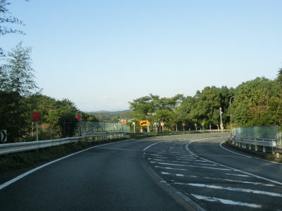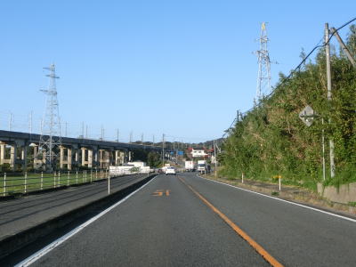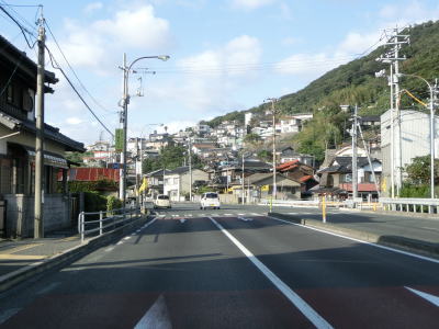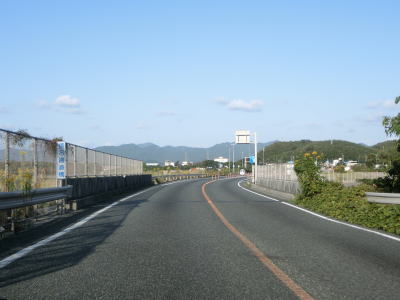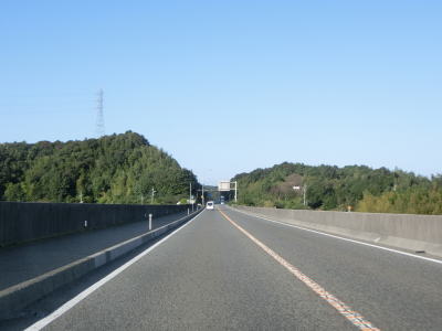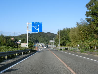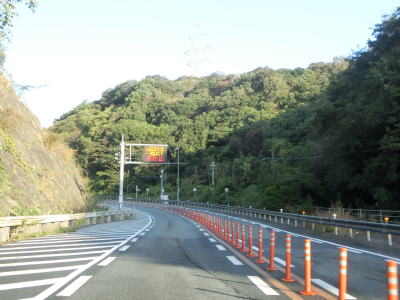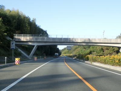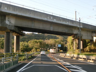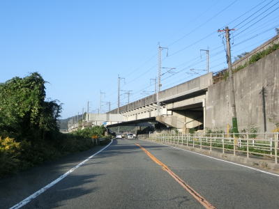 | やや急な右カーブを曲がってさらに山陽新幹線の下を通る。以降は沿線に建物のない状態を走っており、緩やかな上り勾配の2車線道路を走る。カーブが多く見通しが悪いためか、ラバーポールが設置されている箇所もある。峠部分を越えると下り勾配になるが、反対側車線には登坂車線が設置されている。 | ||