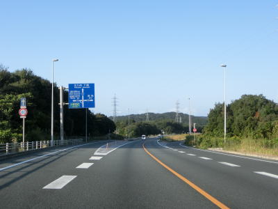 | 緩やかな下り勾配の右カーブを曲がっていると山口r225談合東交差点を通過する。案内標識は設置されているものの地名が表記されていないのはr225が旧道であるためだろう。談合東交差点からもしばらくは片側2車線道路が続くが、市道との談合峠交差点を過ぎると右側車線が減少する。2車線道路になってすぐにE2山陽道の埴生ICを通過する。 | ||