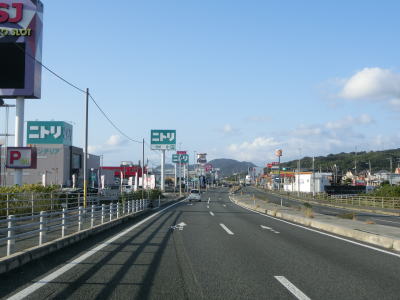 | 木屋川橋や浜田川橋といった連続する高架橋を渡って左カーブを曲がった先で山口r33清末東交差点を通過する。交通量が多い割に流れの良い片側2車線道路を走っていると沿線に郊外型の商業施設が建ち並ぶ中を走る。 | ||