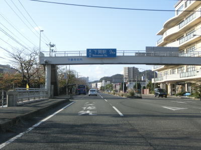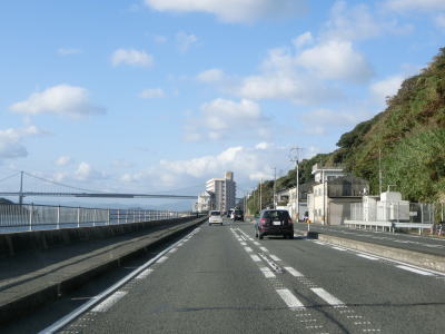 | 前田交差点を過ぎて再び海岸線沿いを走っていると山陽新幹線の新関門トンネルの上を通過するが、当然ながら地上からは何も見えない。E2A中国道/関門道の下関ICに繋がっている市道とのみもすそ川交差点を左にカーブしながら通過する。交差点のすぐ先でR2の関門トンネルの上を通るが、こちらも地上からは何も確認できない。さらに進むと関門橋の下を通る。 | ||