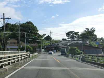 | 本八重川沿いを下っていると本流の大淀川方向の視界が開ける。本八重集落に至る市道との交差点を通過した後に境谷橋を渡って宮崎市に入る。境谷川は大淀川の支流であり、大淀川との合流地点から上流側は都城市と宮崎市の市境となっている。 | ||