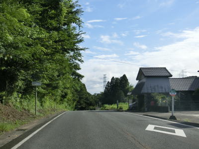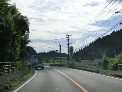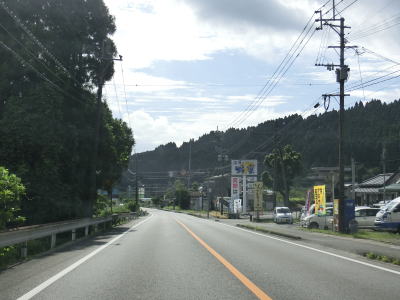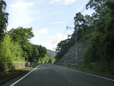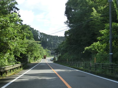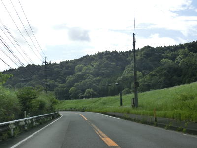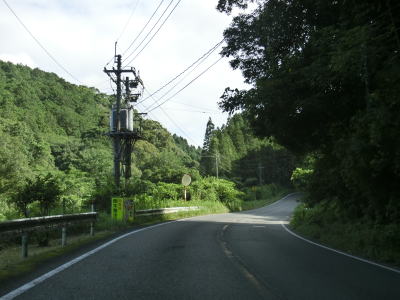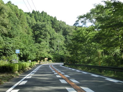 | 上り勾配が続く2車線道路を淡々と走る。「強風時 倒木塔等注意」という看板が設置されている事から台風に限らず強風が吹いた際に倒木やそこまでいかなくても木の枝が散乱する可能性があるのだろう。 | ||