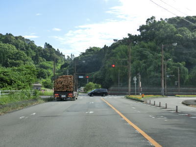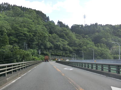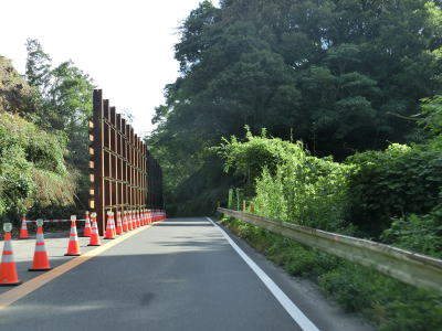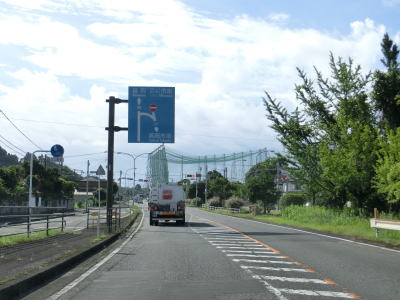 | 椿集落を過ぎた所では法面工事のため片側交互通行規制が敷かれていた。宮崎変電所の入口を過ぎるとやや急な右カーブを曲がるが、カーブ部分のセンターラインにはラバーポールが設置されている。その急カーブとボートピアの間の反対側車線に登坂車線が設置されているが、延長は400m程度と短い。 | ||