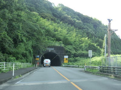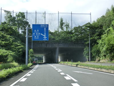 | 右側車線が減少した直後に生目トンネルをくぐる。トンネルの上に高いフェンスが設置されているのが見えるが、生目小学校のグランドがあるためである。上下線が分離した片側1車線道路を走っていると宮崎r9浮田ランプの側道が分岐した先の生目高架橋から対面通行になる。生目高架橋はr9との浮田交差点だけでなく宮崎r334の浮田東交差点の上も通っている。 | ||