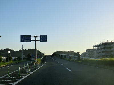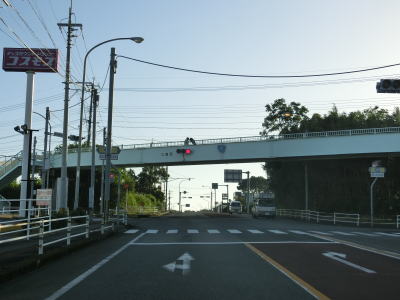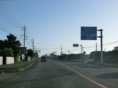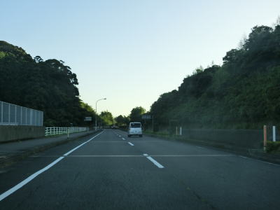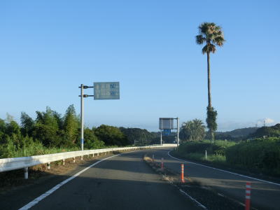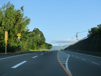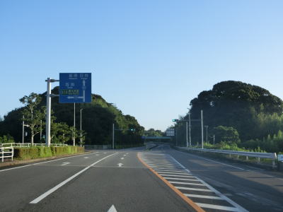 | 日向市に入って少し走ると宮崎r302宮の下交差点を通過する。開けた場所を走っていると反対側車線にゆずり車線が設置されている区間に入る。このゆずり車線の延長は約1.7kmとこれまでのものに比べても長めである。緩やかに下ってゆずり車線の起点を過ぎると宮崎r231美々津中学校入口交差点を通過する。r231は停車場線であり美々津駅の入口に当たる。 | ||