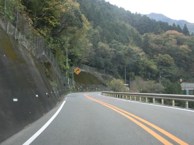 | 自動車であればほとんど気にならない程度の緩やかな勾配を上っていると愛媛r48湯谷口交差点を通過してその後の緩やかな左カーブで愛媛r327交差点を通過する。r327も東温市とを結ぶ県道だが、r152とは異なり道路そのものが存在しておらず分断区間がある。E11松山道の中山川橋の下で異常気象時通行規制区間の起点を通過し、その直後に閉鎖用のゲートを通過する。R196交差点の西に設置されていた雨量情報板の通行止区間はここを指している。 | ||