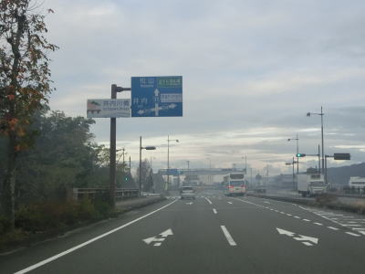 | 福音寺高架橋の緩やかな勾配を上り、伊予鉄道横河原線の線路の手前で側道が分岐する。この側道はR33・R379・R440・R494小坂交差点に向かっている。小坂交差点からの側道が合流すると片側3車線道路になる。小坂交差点からは既に重複しているR494に加えて、R33とR379、R440が重複するため、R11を含めて合計5本もの国道の重複区間となる。ただし、おにぎりはR11しか設置されていない。 | ||