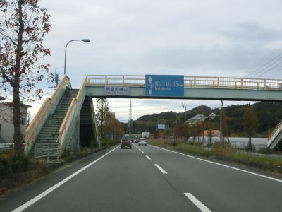 | 車線が増えて片側2車線道路になった直後に愛媛r210・r334則之内交差点を通過する。緩やかな右カーブを曲がりながら新川内橋を渡る。左側に見えている橋はE11松山道の表川橋である。 | ||