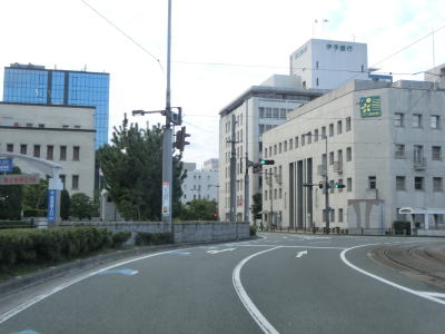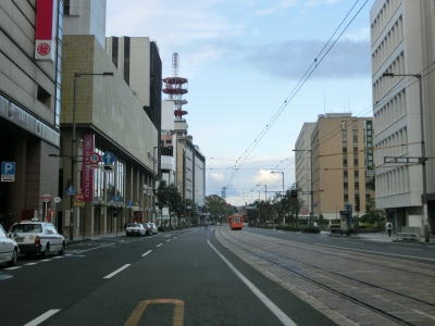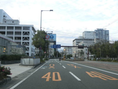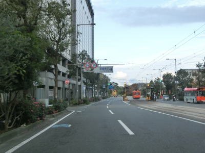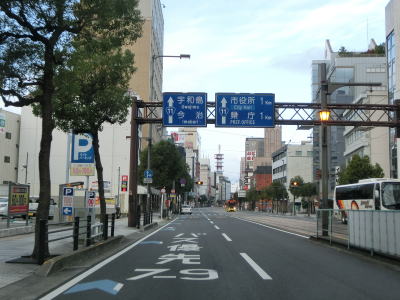 | 282.「宇和島 今治」「市役所1km 県庁1km」 | 283.路面電車(伊予鉄道市内線)が中央部を走る | 284.愛媛県庁の前を通る |