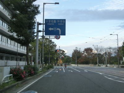 | 片側3車線道路で松山市の中心部に向かって走っていると永木橋を渡り、橋からの勾配を下り切った所で市道との永木交差点を通過する。ここで左端車線が市道への左折専用車線となるため、R11(の他全ての重複している国道)をトレースできるのは真ん中車線と右端車線のみである。 永木交差点からは車線が減って片側2車線道路を走り、約600m北のR33・R317・R379・R440・R494・愛媛r20勝山交差点を左折する。ここからはさらにR317が重複しており、合計6本の国道の重複区間となる。 |