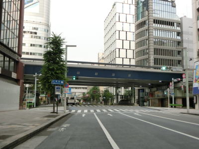 | 東京高速道路の銀座新橋からは南向き3車線+北向き2車線の変則的な車線の数になる。東京r316・r405交差点からはさらに車線が増えると同時に中央分離帯が現れる。また、この交差点を境に地下を通っているのが東京メトロ銀座線から都営地下鉄浅草線に代わる。 ゆりかもめの新橋駅の下を通った直後に東海道新幹線とJR東海道本線、山手線、京浜東北線のガードをくぐり、東京r405・r481東新橋1(日比谷神社前)交差点を通過する。ここで右端の車線が右折車線となる。 |