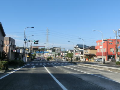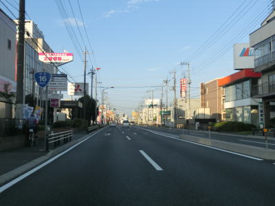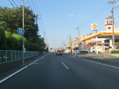 | アウトレットパークを通り過ぎると大きく左にカーブして埼玉r8宮寺交差点を通過し、さらに走り埼玉r219宮寺南交差点を道なりに左に曲がる形で通過する。宮寺南交差点から少し走ると埼玉・東京r179二本木交差点を通過するが、北側が都県境となっており交差点を通過すると東京都瑞穂町に入る。 東京都に入ったからと言っても道路や周辺の状況には特に変化はなく、交通量の多い片側2車線道路が続いている。沿線には商業施設や物流拠点が多いのもこれまでと同じである。二本木交差点から約1.0kmで東京r166狭山平交差点となり、道なりに右にカーブして交差点を通過する。r166が瑞穂町の市街地を通り抜けてから再びR16に交差しているルーティングを考えると旧道であるのは間違いないだろう。 |