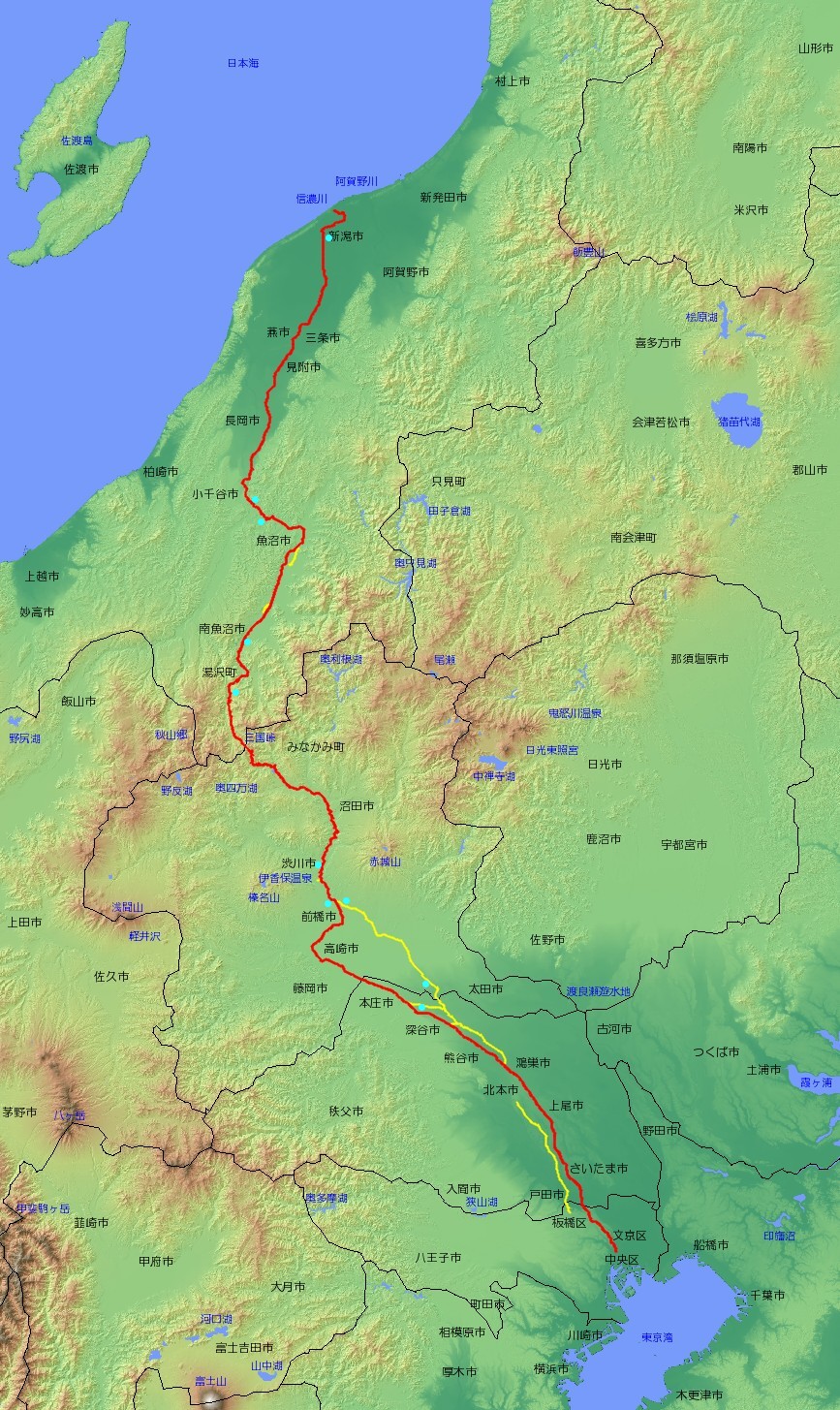 | 主な経由地 | 東京都中央区〜千代田区〜文京区〜豊島区〜北区〜板橋区〜 〜埼玉県戸田市〜蕨市〜さいたま市〜上尾市〜桶川市〜北本市〜鴻巣市〜行田市〜熊谷市〜深谷市〜本庄市〜 〜群馬県藤岡市〜高崎市〜前橋市〜渋川市〜沼田市〜みなかみ町〜 〜新潟県湯沢町〜南魚沼市〜魚沼市〜小千谷市〜長岡市〜見附市〜三条市〜新潟市 |