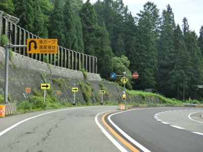 | 新境橋を渡る終えて緩やかな右カーブから600mの区間は6%の急勾配を下ると次の左、右の連続ヘアピンカーブがあり、最初のカーブにだけ分離帯が設置されている。連続ヘアピンカーブ区間が終わると直線的な2車線道路となる。 | ||
