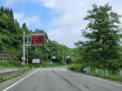 | 旧川口町の中心部と魚野川の堤防の間を走っていると登坂車線が現れた後に新潟r71との4ヶ所目の交差点を通過する。その後は上り勾配となる。道路状況が良いため急勾配には見えないが、6%と意外に急で凍結積雪時に登坂不能になる車両が発生しているようである。また、この勾配区間は雨量通行規制区間に指定されており、連続雨量180mm超で通行止になる。川口跨線橋でJR上越線をオーバーパスした後に新潟r421交差点を通過する。 | ||