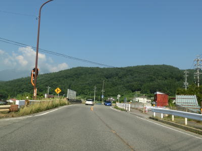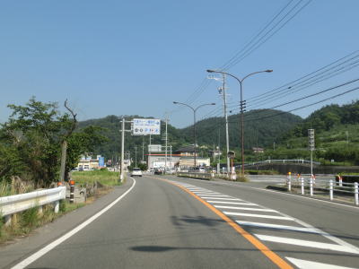 | 異常気象時通行規制区間に入ってからも走りやすい2車線道路が続いている。豊野町川谷集落を通り過ぎると集落が途切れて鳥居川の谷筋を走る。若干カーブは多いものの2車線道路なので走りにくさはほとんど感じない。そんな道路を走っていると緩やかな左カーブで市町境を越えて飯綱町に入る。 | ||