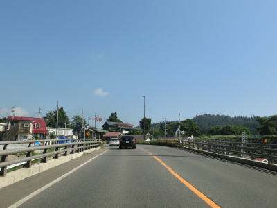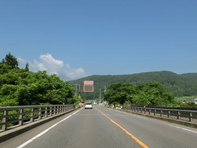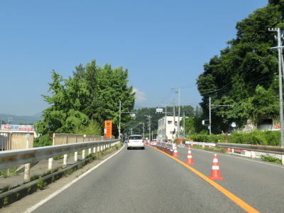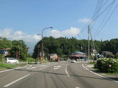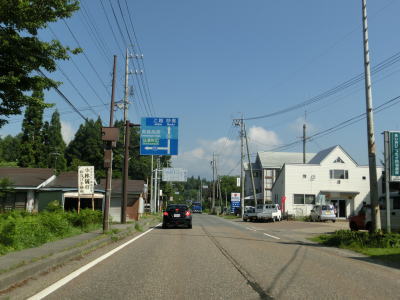 | 浅野交差点を過ぎると緩やかな勾配を上ってJR飯山線をオーバーパスする。その後はほぼ平坦でカーブの少ない2車線道路を走る。風景の長閑さの割に交通量は多いが、信号機付きの交差点が少ないため流れはスムースである。しなの鉄道の北しなの線と鳥居川を挟むような状態になると大倉チェーン着脱場を通過し、程なくして雨量表示板の脇を通過する。それによるとこの先2kmの区間が連続雨量150mm超で通行止となる。 | ||