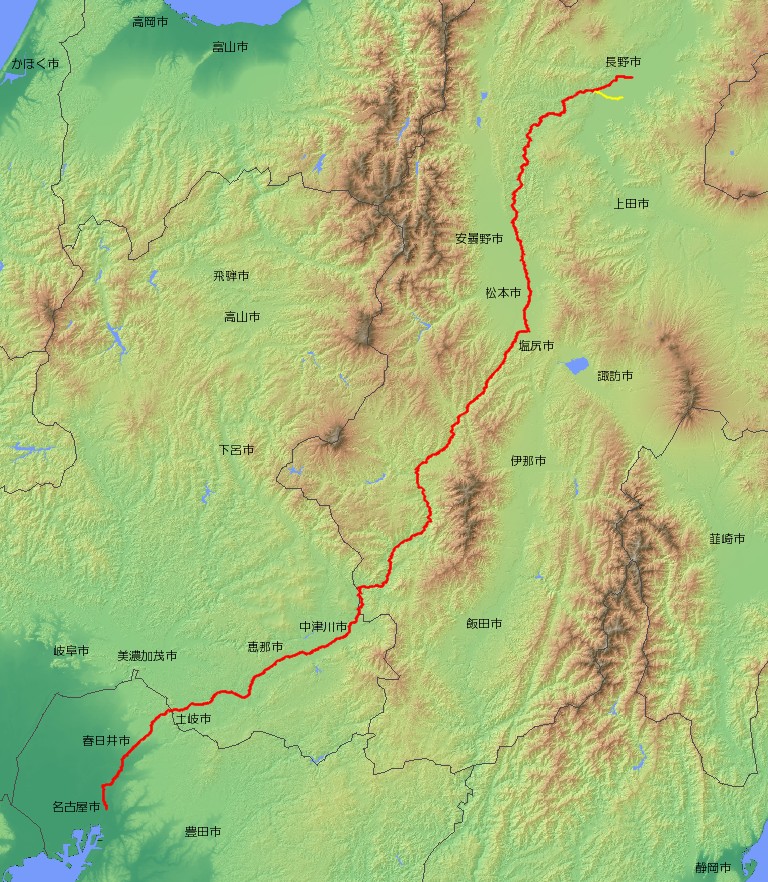 | 主な経由地 | 愛知県名古屋市〜春日井市〜 〜岐阜県多治見市〜土岐市〜瑞浪市〜中津川市〜 〜長野県南木曽町〜木曽町〜塩尻市〜松本市〜安曇野市〜長野市 |