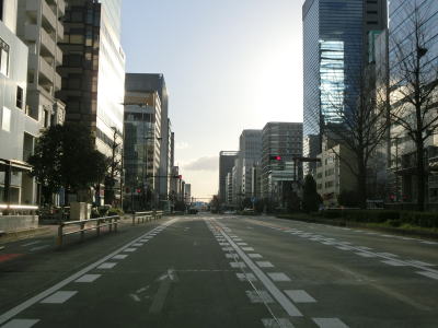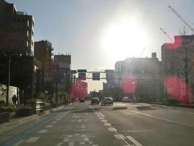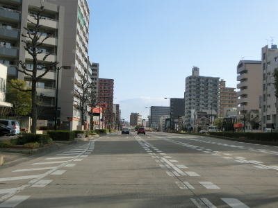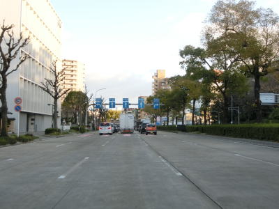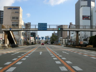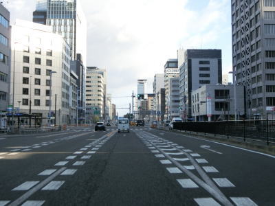 | 市道との九丁堀交差点では左端車線が左折専用車線、右端車線が右折専用車線となるが、交差点を過ぎると片側5車線に戻る。山王通と呼ばれる市道との古渡町交差点を通過するが、ここでも両端の車線が左折もしくは右折専用車線になる。交差点の上を横切っているのは名古屋高速の都心環状線である。阪神高速の環状線と同様に時計回りの一方通行である。 古渡町交差点以降も片側5車線道路が続いているが、両端の車線が左折もしくは右折車線となる交差点が連続しているため実質的には片側3車線道路と言える。大須通という市道との西大須交差点からは地下鉄鶴舞線が道路の下を通っており、程なくして若宮大通との若宮南/北交差点を通過する。交差点の上を横切る名古屋高速の2号東山線を挟んで南交差点と北交差点に別れているが、当然ながら信号機のタイミングは連動している。若宮北交差点以降は完全な片側3車線道路になる。 |
