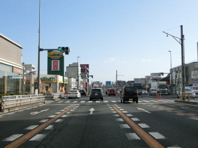 | 高岳交差点から約400m東に進むとR153小川交差点に至り、左折して多治見方面に進む。この交差点がR153の起点だが、終点もR19との交差点である。R19が木曽川流域を通っているのに対してR153は天竜川流域を通っている。 小川交差点からはさらに車線が増えて片側5車線道路になる。外堀通との平田町交差点で右端車線が右折専用車線になってしまうため、交差点の直後は片側4車線になるがすぐに5車線に戻る。愛知r215赤塚交差点で左端車線が左折専用車線に、右端車線が右折専用車線となり交差点の直後は片側3車線になるが、これまたすぐに4車線になる。 |