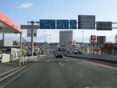 | 左カーブを曲がって岐阜r421の上を通過した後に土岐大橋を渡る。橋の下には土岐川の他に岐阜r385もある。JR中央本線をオーバーパスして緩やかな勾配を下っていると岐阜r19泉池ノ上町交差点を通過する。この辺りから土岐市の市街地と言える場所を通っているため沿線の建物は多い。交通量の多い片側2車線道路を走っていると岐阜r84岩畑交差点を通過し、E19中央道とJR中央本線に挟まれた市街地を走ってR21大富交差点を通過する。案内標識には表記されていないが、ここから東はR21が重複している。 | ||