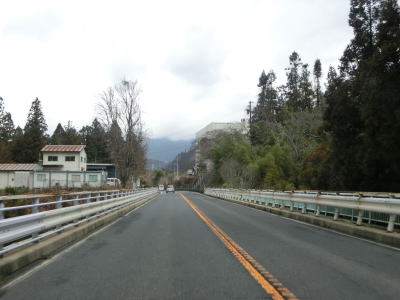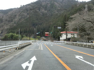 | 旧山口村の中心部を走っていると右カーブを曲がって緩やかな勾配を下った先でR256弥栄橋交差点を通過する。案内標識に表記されていないが、この交差点から塩尻方面はR256が重複している。なお、旧山口村は長野県に所属していたが、平成の大合併によって岐阜県中津川市に越県編入されている。 | ||