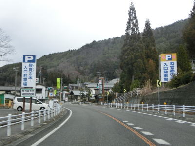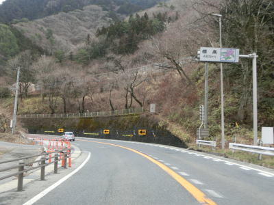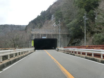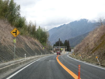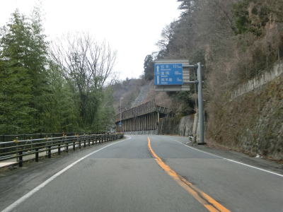 | 弥栄橋交差点からはR256が重複した状態で松本・塩尻方面へと走る。これまでと同様に木曽川に沿った2車線道路が続いている。関西電力の山口水力発電所を過ぎると沿線の家屋がなくなる。木曽川の左岸を走っていると黍生洞門をくぐる。洞門を出るとやや急な右カーブを曲がるが、カーブ部分にはラバーポールが設置されている。 | ||