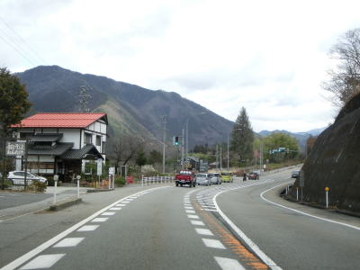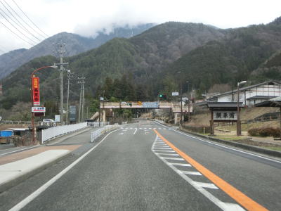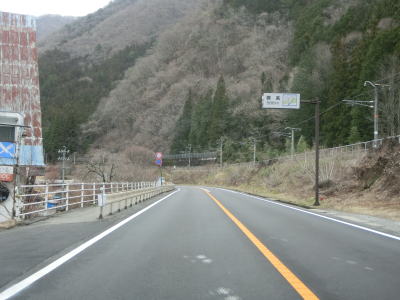 | 妻籠宿入口交差点を過ぎてすぐに吾妻洞門をくぐる。渡島集落を走っているとJR中央本線の橋梁の下をくぐって右カーブを曲がると木曽川沿いとなる。木曽川の左岸を走っていると左カーブを曲がった南木曽町の中心部と言える集落に差し掛かる。 | ||